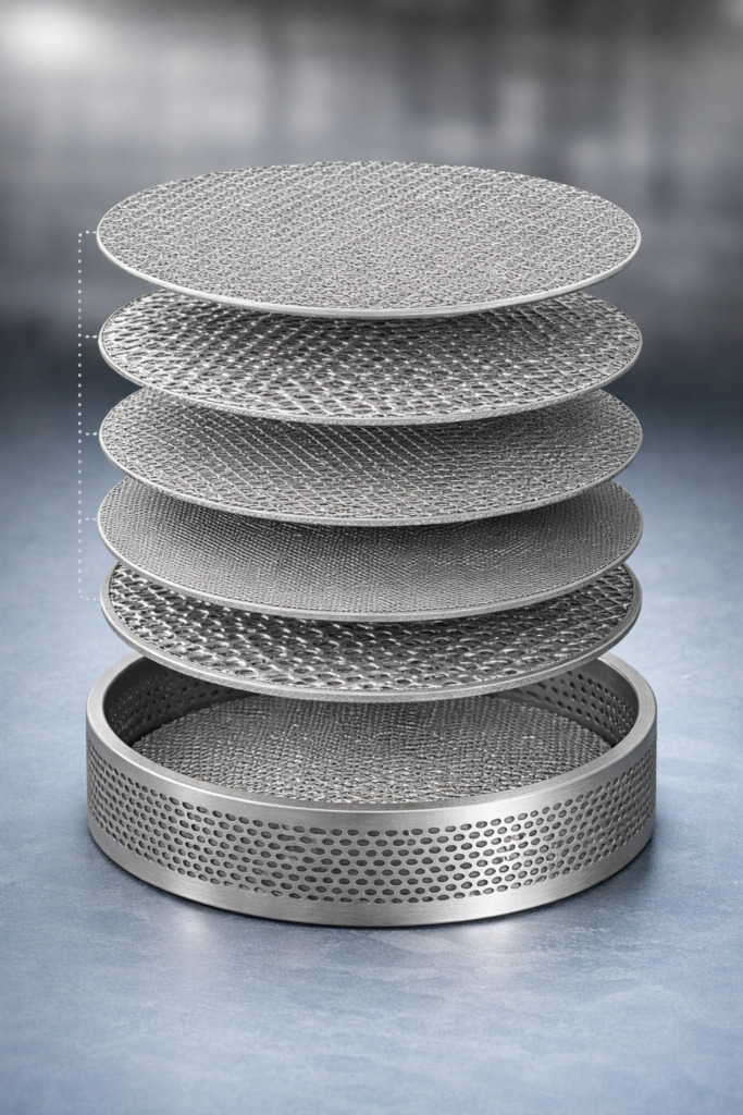 These filters are made by layering multiple screens of different mesh sizes and bonding them through: